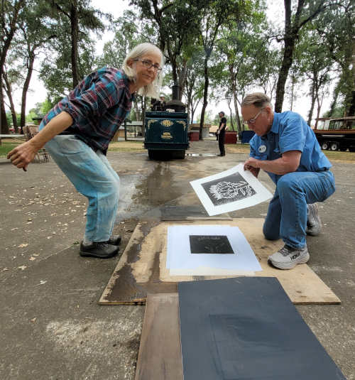 Renowned printmaker Rik Olson will be featured; he is busy carving a 3-foot by 3-foot block to be printed at Recreation Grove during this years’ Steam Festival.