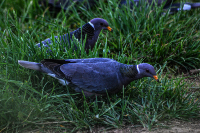 Band-tailed pigeons are ornamented with patterned iridescent green-bronze feathers on the nape of their neck, topped by a white crescent.