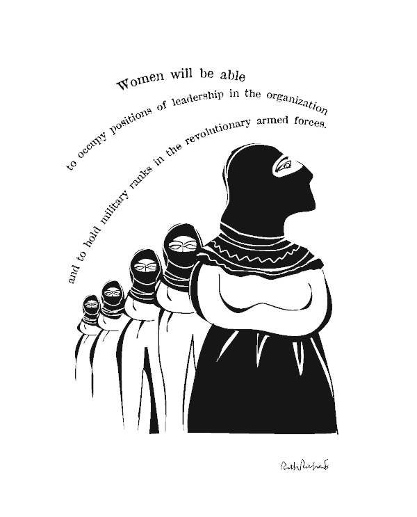 Her digital drawings depict the Women's Revolutionary Law, a set of 10 laws that grant rights to women regarding marriage, children, work, health, education, and political and military participation while protecting them from violence.