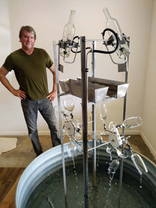"Water is a magical thing," Brill said of his whimsical kinetic sculpture “Tipsy,” an elegant, automated decanter that is somewhat of a riddle as to how it works.