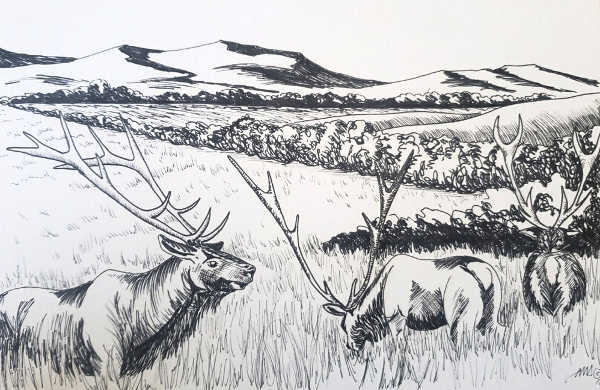 This month's wine and art session with Sabalone is scheduled for June 23 and will feature a scene of elk in a meadow landscape drawn in inks. The session time is 1:30 to 4 p.m.