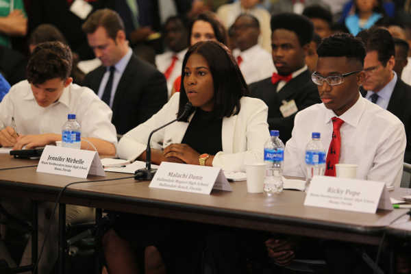 The participating students included Mirsky, 11th Grade, Spanish River High School (FL), Alfonso Calderon, 11th Grade, Marjory Stoneman Douglas High School (FL), Jennifer Mirbelle, 11th Grade, Miami Northwestern Senior High School (FL), Malachi Dunn, 11th Grade, Hallandale Magnet High School (FL), Ricky Pope, 11th Grade, Miami Northwestern Senior High School (FL), Devery Russell, 12th Grade, Miami Lakes Educational Center (FL), Daniel Gelillo, 12th Grade, Richard Montgomery High School (MD), and Taylore Norwood, 12th Grade, King High School (IL). Students shared their experiences with gun violence and proposals for reform.