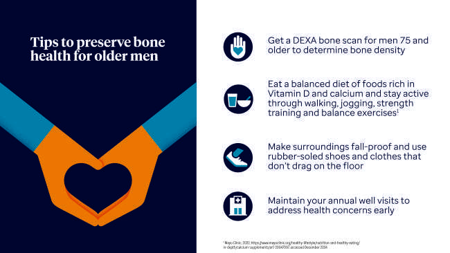 Know Your Numbers – Up to one in four men over the age of 50 will break a bone due to osteoporosis. Men 75 and older might consider discussing the option of a bone density scan, also known as a DEXA scan, with their health care providers. Testosterone levels and other changes impact bone health. The bone scan measures the mineral content, particularly calcium, to determine bones’ density. Based on the results, providers may recommend treatments. This test is generally covered under Medicare and other health plans.