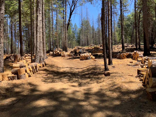 The trees were cut into firewood-sized pieces and stacked along Forest Road 18N69 at the junction of Forest Road 18NO5. Firewood mainly consists of seasoned Douglas-fir and sugar or ponderosa pine.