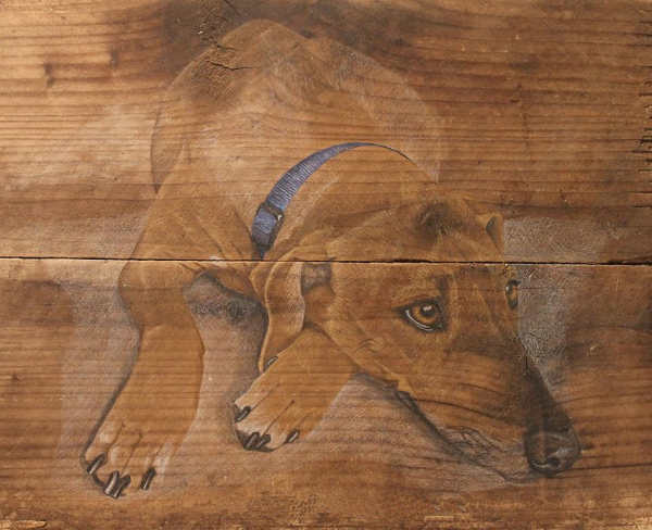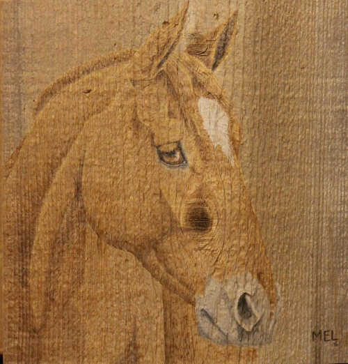 Artist Megan Elaine Luis’ specialty is western-themed colored pencil drawings on old barn wood.