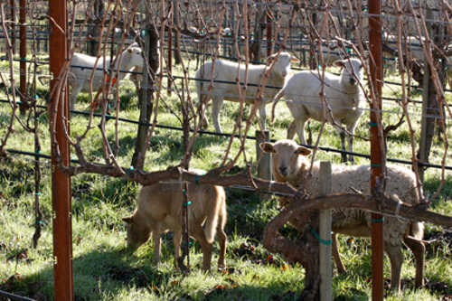 Allowing sheep to graze on vineyard cover crops throughout the growing season removes the need for mechanical cultivation, tillage or mowing between rows and under vines. Courtesy photo from Kelly Mulville.