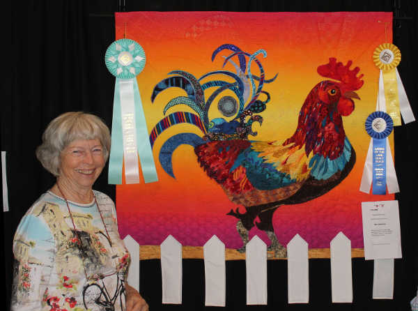 Special ribbons were awarded to the best quilts in three categories. Linda Jensen received the Best Art Quilt for “Happy 70th Anniversary.” Best Innovative Quilt was awarded to Marj Sweeney for “Banty Rooster.” While Marian Drain received the Best Traditional Quilt for “Returning Home.”