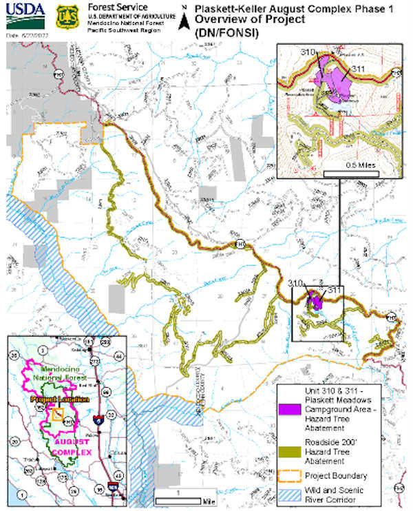 The project area is near Plaskett Meadows Campground, which experienced high levels of tree mortality during the 2020 August Complex and has not reopened due to the safety hazards.