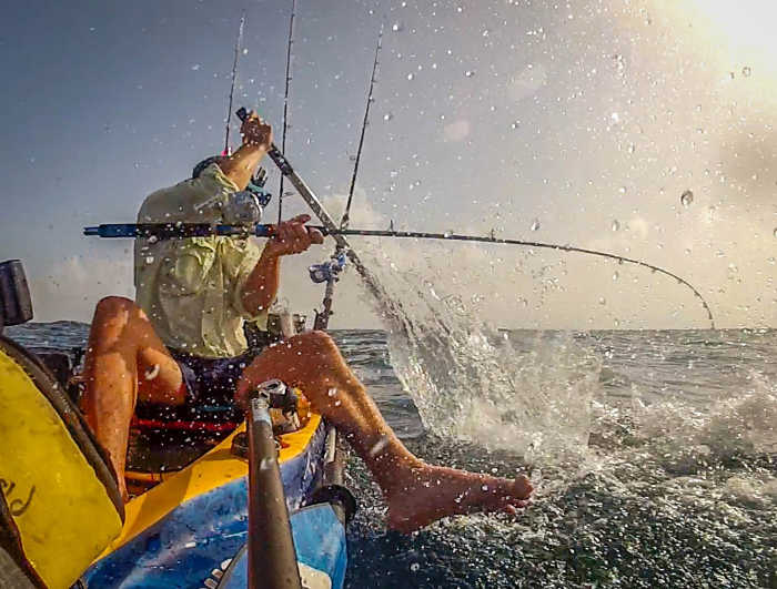 From a kayak, this would be dangerous. Instead, I would tie the other end of the rope to an A1 buoy and throw the buoy overboard. The fish then fights the buoy, tires itself out, and then once tired it can be hauled in and dispatched safely.