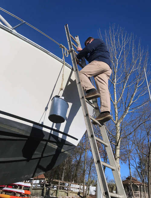 1. Injuries from ladder falls can be severe but are preventable. When using a ladder to climb aboard your frozen boat, be sure it is firmly planted, secure it with a line to avoid shifting, and have someone hold the base. Never descend a ladder facing forward or with your arms full. If moving tools, supplies or other objects to and from the deck, lower or raise them in a bucket using a rope.