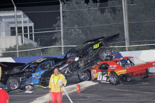 Those towed to the pits with extensive damage were DeRosier, Ian Elliott, Sammy Solari, Keith Bloom, Donovan Cox, Buzz DeVore and Sal Lopez. All drivers were uninjured.