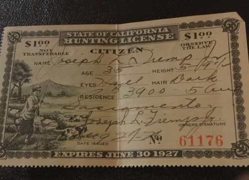 Question: My grandfather was born in 1890 and was a resident of Sacramento. Recently I was going through some documents that were given to me years ago upon his passing, and I found his 1927 fishing and hunting licenses. The cost was $1 each. I thought these were really cool and wonder what you might be able to tell me about them. (Gary)