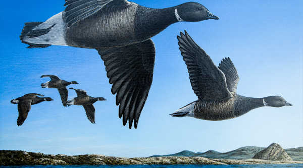 The painting, which depicts five black brant, a species of goose, in flight over an estuary containing eel grass, will be the official design for the 2018-19 stamp.